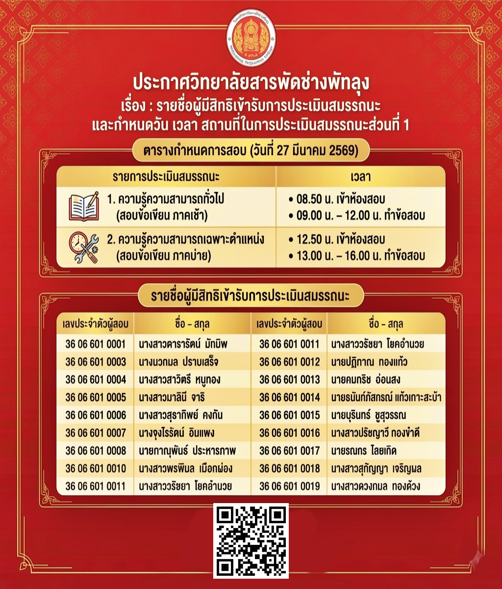 ประกาศวิทยาลัยสารพัดช่างพัทลุง เรื่อง: รายชื่อผู้มีสิทธิเข้ารับการประเมินสมรรถนะ และกำหนดวัน เวลา สถานที่ในการประเมินสมรรถนะส่วนที่ 1 20 มี.ค. 69